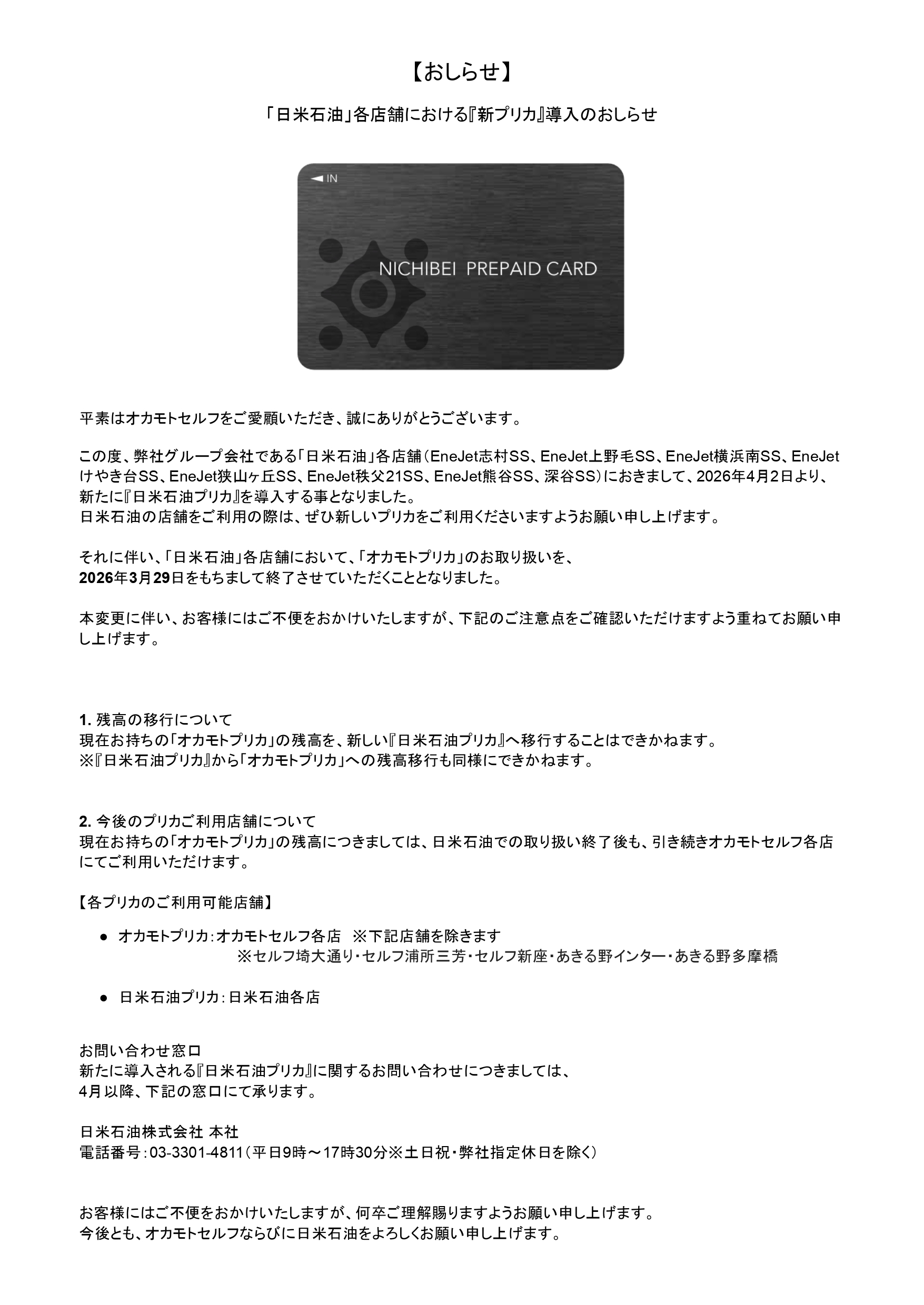 「日米石油」各店舗における『新プリカ』導入のおしらせ