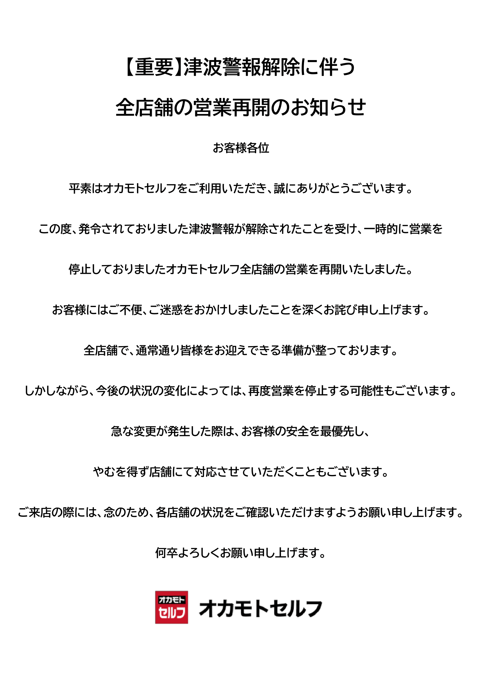 【重要】全店舗の営業再開のお知らせ